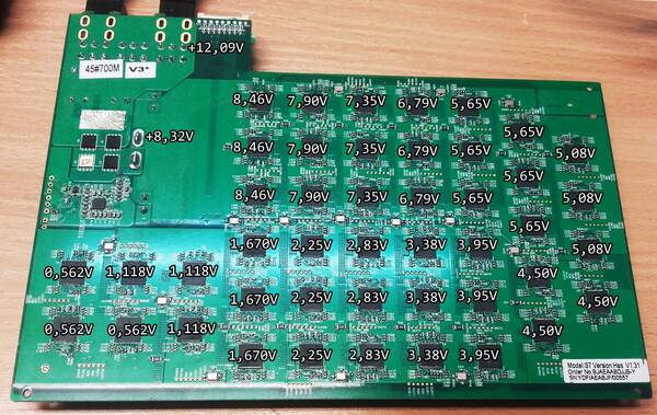 despues de conectar 3.3 en el conector de 18 pines el voltaje de 8.32 sata a 10.56 Parece que hay tres chips en serie, y luego 15 grupos en paralelo bitcointalk-sidehack: thats about exactly what you should be seeing, so it means the power circuit is functional. Next thing would be to poke reset, TX, RX and clock lines at the 18-pin and see if those signals make it all the way to the last chip in the chain. This should be done while the board is powered up, of course. Signals in Antminers go uphill, so the first chip would be on the lowest-volt node and the last is at the highest. I'm not sure offhand where those are but it shouldn't be too hard to tell.