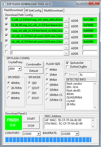 Downloadable files are located in the “bin” directory with the firmware files. For each file you must specify a valid address download. Use the following table to select files and destination addresses: Файл в каталоге bin Флеш 8Mbit (512KB+512KB) Флеш 16Mbit (1024KB+1024KB) esp_init_data_default.bin 0xFC000 0x1FC000 blank.bin 0xFE000 0x1FE000 boot_v1.4(b1).bin or later 0x00000 0x00000 user1.1024.new.2.bin (in subdirectory “at”) 0x01000 0x01000 user2.1024.new.2.bin (in subdirectory “at”) 0x81000 0x81000